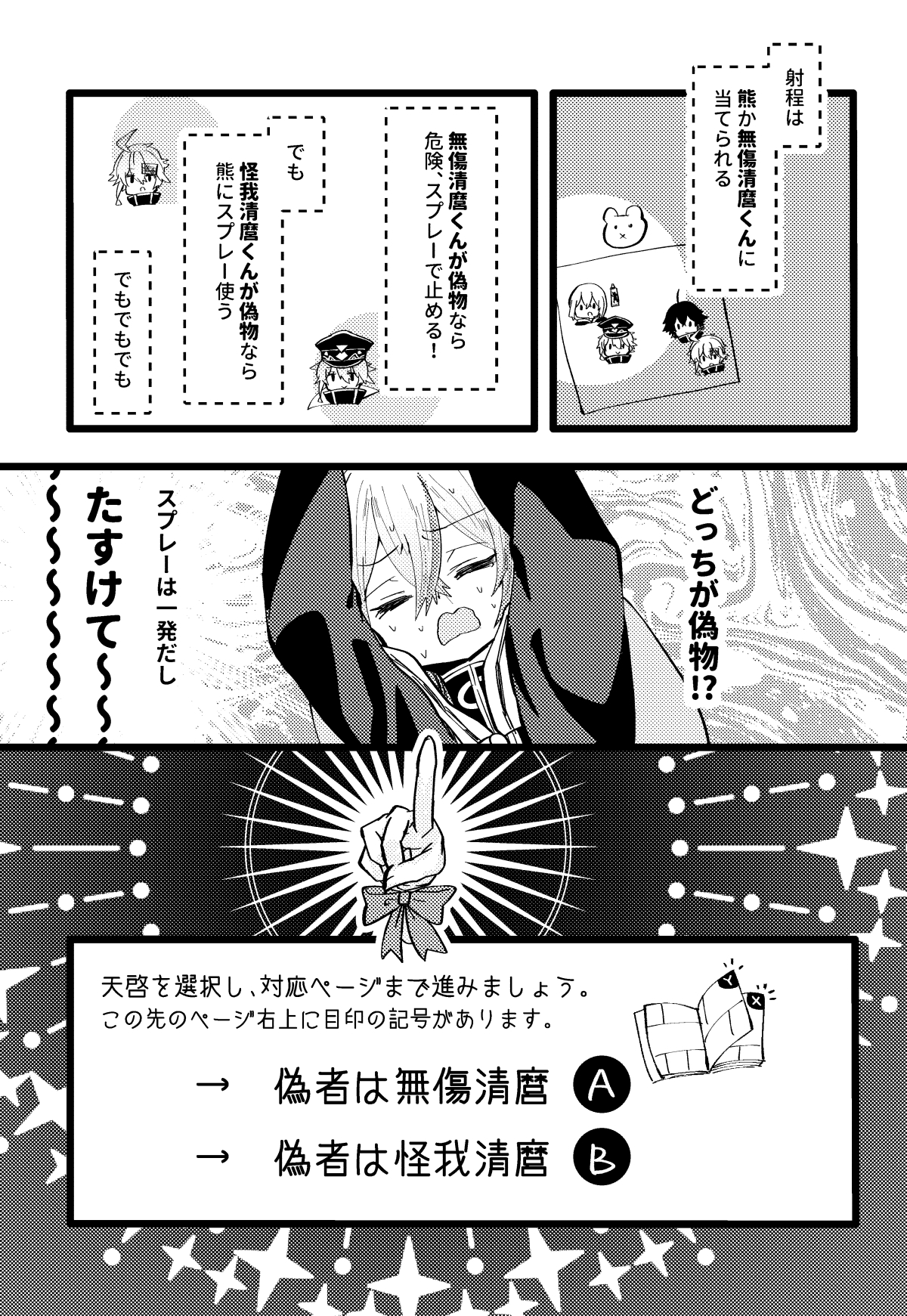 11/16のイベントで本が出ます! とらのあな通販あります 装丁は悠さんにお願いしました! A5/漫画33p この物語には、あなたの助けが必要です。 江戸三作vsドッペルゲンガーvs熊、結末分岐あり・ゆかいなライトミステリ
